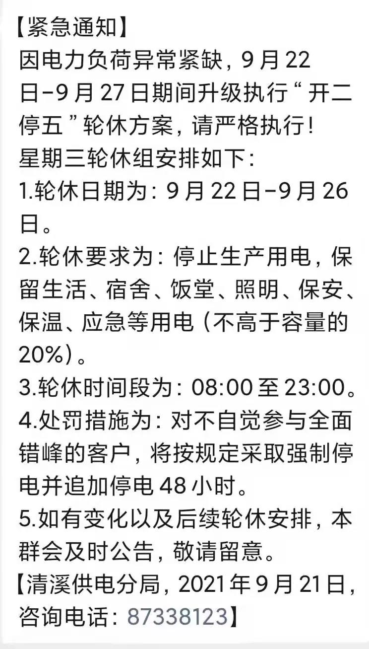 廣東電網通知顯示,于9月16日起執行“開二停五”限電措施,錯峰期間,保安負荷保留在總負荷15%以下,錯峰時間為7:00-23:00。若不配合,將面臨10天查封處理?。?!