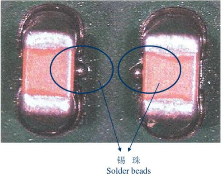 錫珠是回流焊中常見的缺陷之一,它不僅影響外觀而且會引起橋接。錫珠可分為兩類:一類出現在片式元器件一側,常為一個獨立的大球狀(如下圖1);另一類出現在IC引腳四周,呈分散的小珠狀。